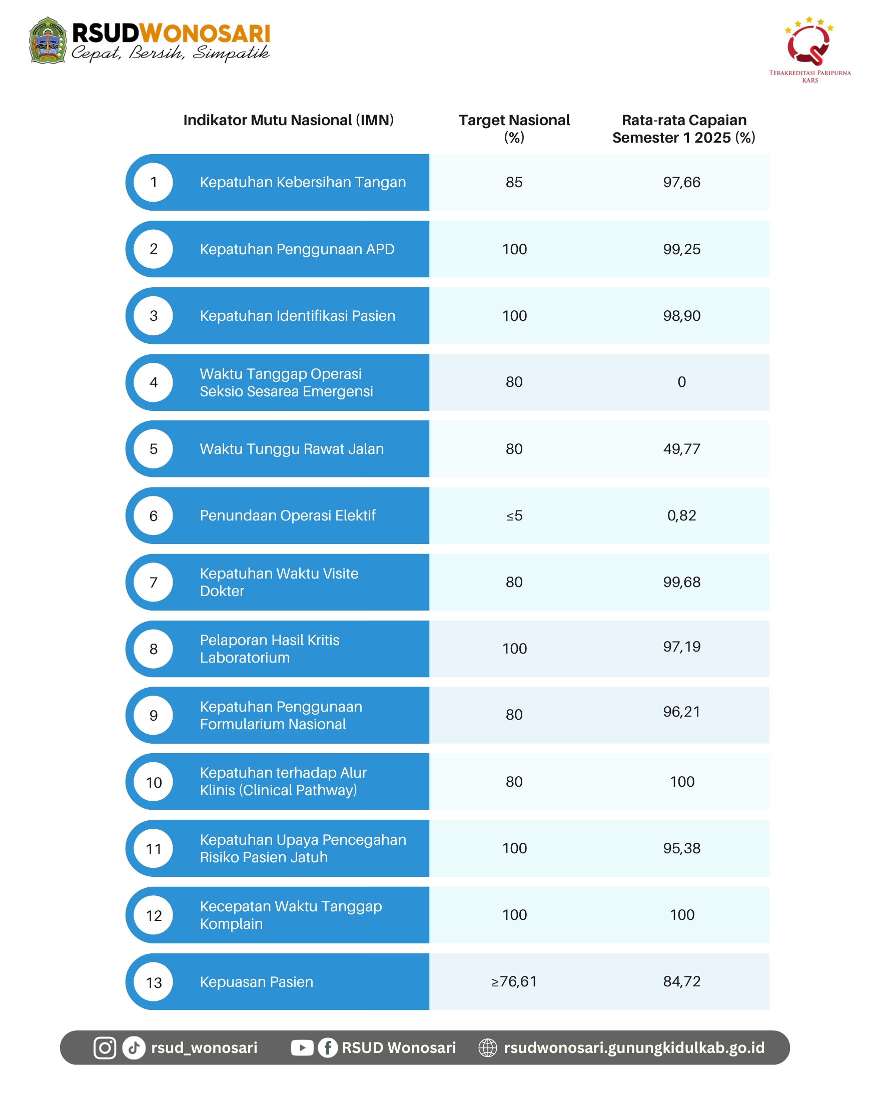 Capaian IMN RSUD Wonosari Semester 1 Tahun 2025 menunjukkan hasil yang sangat baik, dengan 85% indikator mencapai atau melampaui target nasional. Kinerja tertinggi terlihat pada kepatuhan penggunaan APD, penerapan alur klinis, dan kecepatan tanggap komplain. Hasil ini mencerminkan dedikasi seluruh tenaga kesehatan dalam memberikan pelayanan yang aman, efektif, dan berorientasi pada keselamatan pasien. RSUD Wonosari berkomitmen untuk terus berinovasi dan melakukan perbaikan berkelanjutan guna mewujudkan pelayanan kesehatan yang bermutu, profesional, dan terpercaya bagi masyarakat Gunungkidul.
