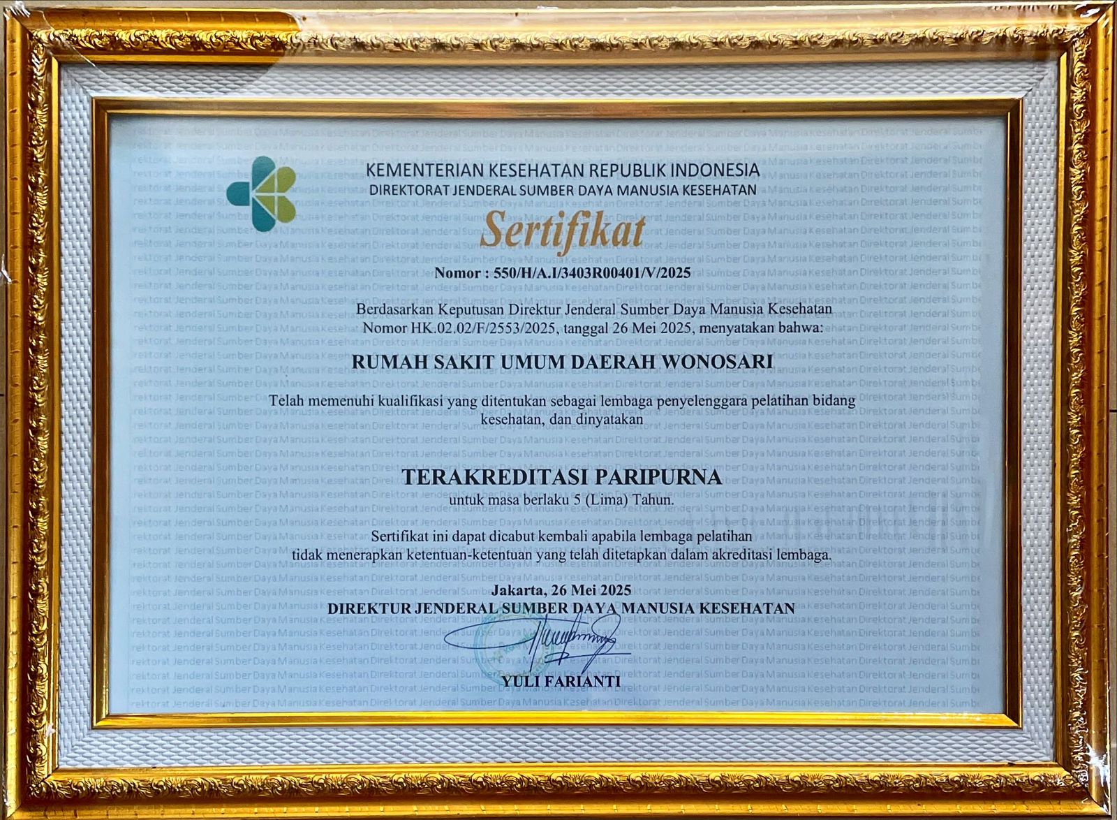 Dalam kesempatan tersebut, RSUD Wonosari dinyatakan lulus akreditasi dengan predikat Paripurna A, menunjukkan bahwa rumah sakit telah memenuhi standar tertinggi dalam penyelenggaraan pelatihan kesehatan.