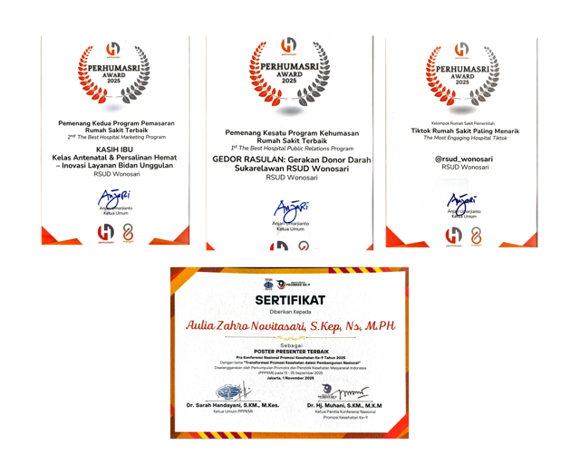Pada ajang Perhumasri Award, RSUD Wonosari berhasil meraih tiga kategori sekaligus, termasuk gelar 1st Best Program Public Relation melalui program unggulan "GEDOR RASULAN" (Gerakan Donor Darah Sukarelawan). Program ini merupakan aksi donor darah rutin yang diinisiasi sejak 2018 sebagai kontribusi dalam mendukung ketersediaan darah di Kabupaten Gunungkidul. Selain itu, program "KASIH IBU" (Kelas Antenatal & Persalinan Hemat), sebuah inovasi layanan bidan unggulan berupa optimalisasi Kelas Ibu Hamil dan Parsel BuDebi, sukses meraih predikat 2nd Best Marketing Program. Keberhasilan ini dilengkapi dengan penghargaan untuk kategori TikTok Paling Menarik, menandakan keunggulan RSUD Wonosari dalam komunikasi digital.