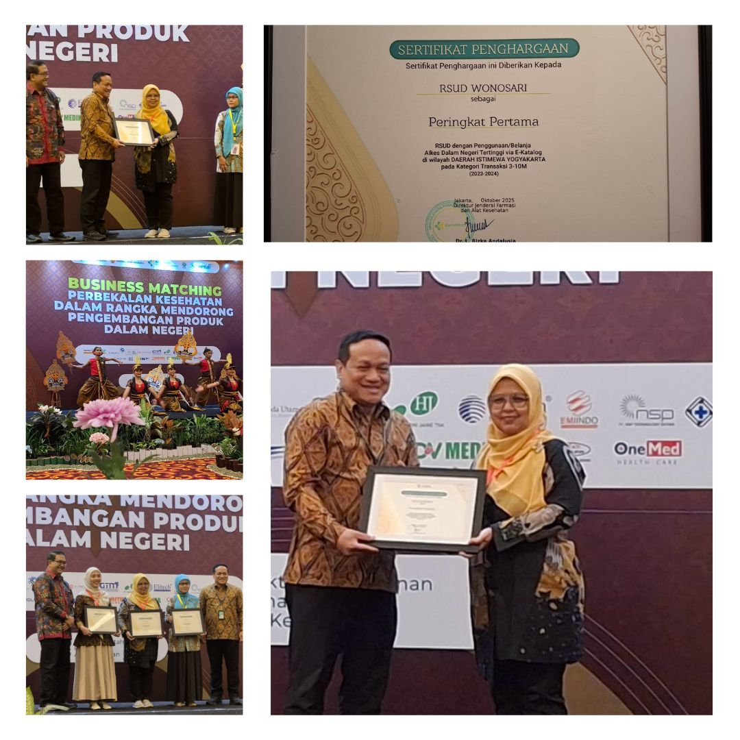 Wonosari 8 Oktober 2025- Rumah Sakit Umum Daerah ( RSUD ) Wonosari meraih penghargaan peringkat Pertama dengan penggunaan Alkes dalam negeri tertinggi via. E- Katalog diselanggarakan oleh Kementrian Kesehatan melalui Direktorat Ketahanan Farmasi. Acara ini berlangsung pada 8-10 Oktober 2025 di Alana Hotel & Convention Center, Sleman, Yogyakarta.